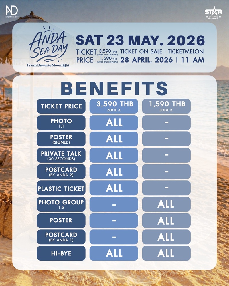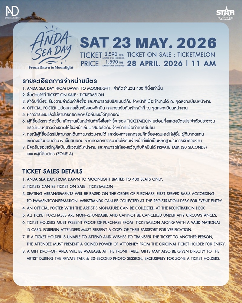 เตรียมตัวให้พร้อม! ในวันอังคารที่ 28 เมษายน 2569 เวลา 11.00 น. เปิดจำหน่ายบัตร 2 ราคาอย่างเป็นทางการ คือ บัตรราคา 3,590 บาท (จำนวน 150 คน) และบัตรราคา 1,590 THB (จำนวน 250 คน) ผ่านช่องทางจำหน่าย Ticketmelon ใครจะได้เป็น 400 คนพิเศษในค่ำคืนนี้? วอร์มนิ้วให้พร้อม แล้วไปสร้างความทรงจำจากรุ่งเช้าจรดแสงจันทร์ด้วยกันในงาน ANDA SEA DAY From Dawn to Moonlight ห้ามพลาด!