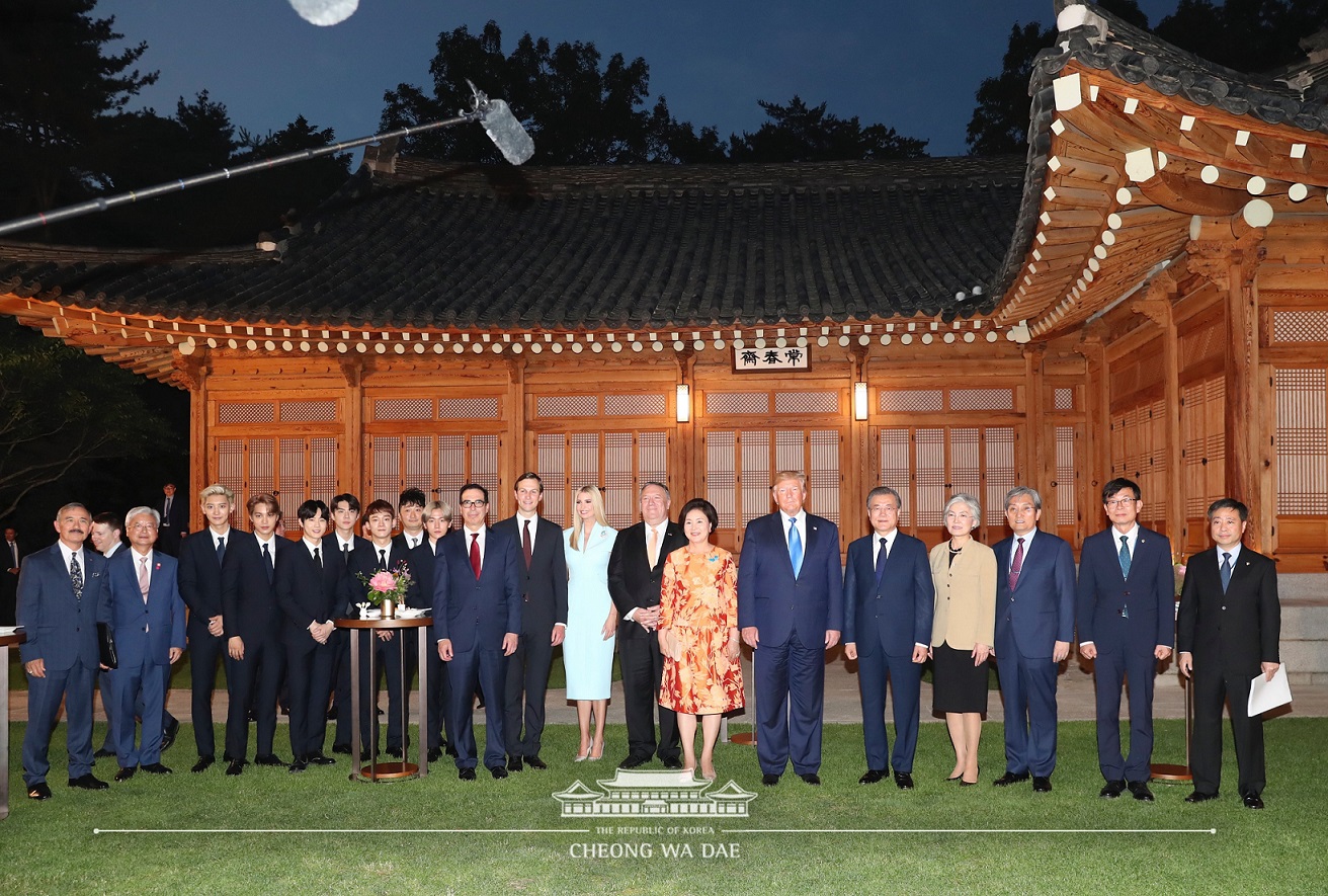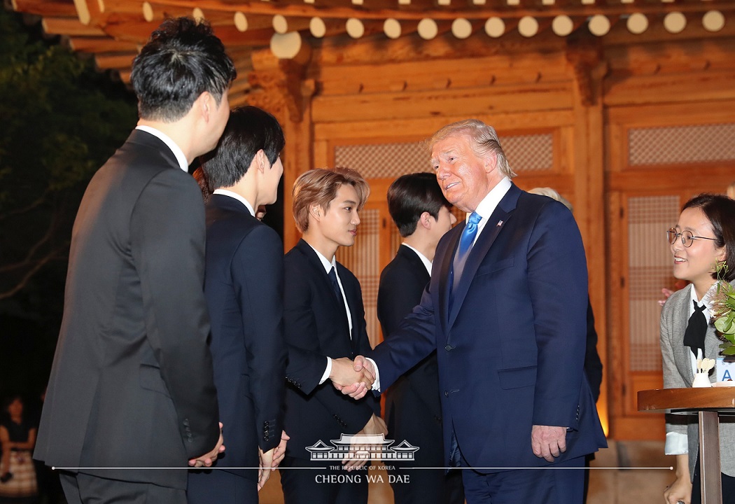 ‘EXO’ วงเค-ป๊อปตัวแทนแห่งเกาหลีใต้ ร่วมต้อนรับประธานาธิบดีแห่งสหรัฐอเมริกา  ‘โดนัลด์ ทรัมป์’ ณ บลูเฮาส์ ประเทศเกาหลีใต้