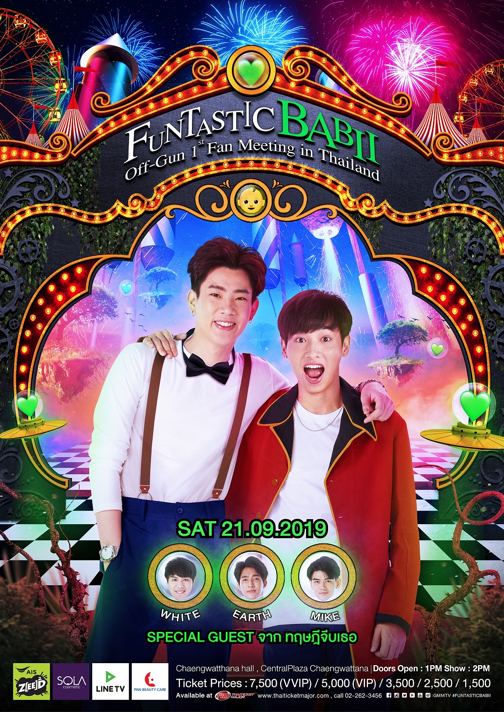 เปิดจองบัตร “Fun Tastic BABII : OFF-GUN 1st FAN MEETING IN THAILAND” วันพฤหัสฯ ที่ 1 สิงหาคมนี้ เวลา 10.00 น. เป็นต้นไป ทาง thaiticketmajor ทุกสาขา หรือwww.thaiticketmajor.com และ Call Center โทร 0-2262-3456 บัตรราคา 7,500 (VVIP) / 5,000 (VIP) / 3,500 / 2,500 / 1,500 บาท และติดตามความเคลื่อนไหวได้ที่ Facebook / Instagram / Twitter / Line TV / YouTube / Weibo : GMMTV