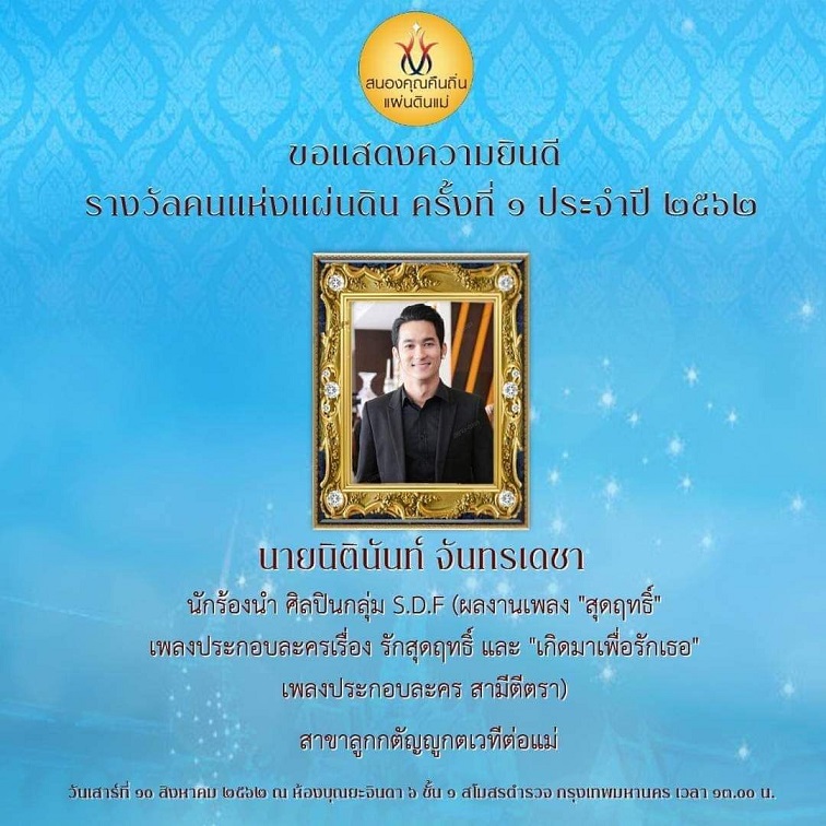 พักเบรคเคลียร์คิวจากงานโชว์ หนุ่มแซ่บหุ่นเซี๊ยะ! ที่สุดแห่งย่านอโศก “แชมป์-นิตินันท์ จันทรเดชา” นักร้องหนุ่ม แห่งวง S.D.F ค่าย แกรนด์มิวสิก ขอทดแทนคุณพ่อแม่ เข้ารับรางวัลลูกกตัญญู รางวัลคนแห่งแผ่นดิน ครั้งที่ 1 ประจำปี 2562 สาขาลูกกตัญญูกตเวทีต่อแม่ ณ ห้องบุณยะจินดา สโมสรตำรวจ เมื่อวันก่อน ซึ่งเจ้าตัวดีใจมากๆ กล่าวกับเราอย่างตื่นเต้นว่า… “ขอบคุณรางวัลคนแห่งแผ่นดิ