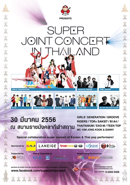 ร่วมส่งกำลังใจ และเสียงเชียร์ให้ศิลปินคนโปรด อย่าง Girls’ Generation (เกิร์ลสเจเนเรชั่น), EXO-M (เอ็กโซ-เอ็ม), B1A4 (บีวันเอโฟร์), Teentop (ทีนท็อป),Groove Rider (กรู๊ฟไรเดอร์ส), Thaitanium (ไทยเทเนี่ยม), Tor+ (โต๋ ศักดิ์สิทธิ์ เวชสุภาพร) ได้ในโชว์กระชับมิตรไทย-เกาหลีสุดยิ่งใหญ่ ในวันที่ 30 มีนาคม นี้ ณ ราชมังคลากีฬาสถาน