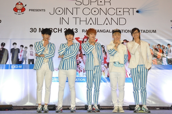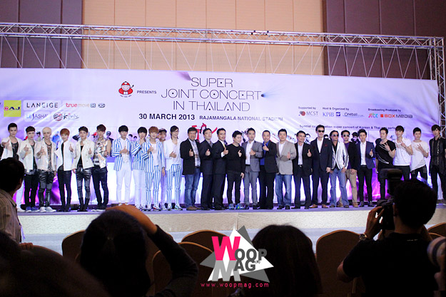ช่วงบ่ายวันศุกร์ที่ 29 มีนาคม บริษัท ทีวี ไดเร็ค จำกัด (มหาชน) จัดงานแถลงข่าวยืนยันความพร้อมเต็มร้อยของคอนเสิร์ต“เถ้าแก่น้อย Presents Super Joint Concert in Thailand” ขึ้นที่โรงแรมเดอะแกรนด์ โฟร์วิงส์ คอนเวนชั่น ศรีนครินทร์ งานนี้เพียงแค่เริ่มต้นก็สนุกแล้ว เพราะพอพิธีกรของงานกล่าวต้อนรับทุกคนเข้าสู่งานเรียบร้อยก็เชิญศิลปินที่มาร่วมงานขึ้นถ่ายภาพหมู่พร้อมกันบนเวทีเป็นการเปิดงานอย่างเป็นทางการ โดยเชิญศิลปิน ได้แก่ Groove Rider (กรู๊ฟไรเดอร์ส) , Thaitanium (ไทยเทเนี่ยม) , โต๋ ศักดิ์สิทธิ์ เวชสุภาพร และ VICTOR , EXO-M, B1A4 หลังจากนั้นได้เชิญผู้บริหาร และ สปอนเซอร์ผู้เกี่ยวข้องที่นำคอนเสิร์ตสุดพิเศษแบบนี้มาให้ทุกคนได้ชม ขึ้นถ่ายภาพหมู่ร่วมกับศิลปินบนเวที ได้แก่ Mr.Lee Jae Ho ( ลีแจโฮ ) จาก KPIB (กระทรวงวัฒนธรรมและการกีฬาเกาหลี) , คุณทรงพล ชัญมาตรกิจ ประธานเจ้าหน้าที่บริหาร บริษัท ทีวี ไดเร็ค จำกัด (มหาชน) , คุณเกเว่น ปูริชิม่า กรรมการผู้จัดการ บริษัท One Ball จำกัด , คุณอิทธิพัทธ์ กุลพงษ์วณิชย์ ประธานเจ้าหน้าที่บริหาร บริษัทเถ้าแก่น้อย ฟู๊ด แอนด์ มาร์เก็ตติ้ง จำกัด พร้อมสปอนเซอร์ผู้สนับสนุนกิจกรรอีกหลายท่านขึ้นบนเวที หลังจากถ่ายภาพหมู่เรียบร้อย ได้มีการเชิญตัวแทนศิลปินของแต่ละวงขึ้นสัมภาษณ์พูดคุยบนเวที