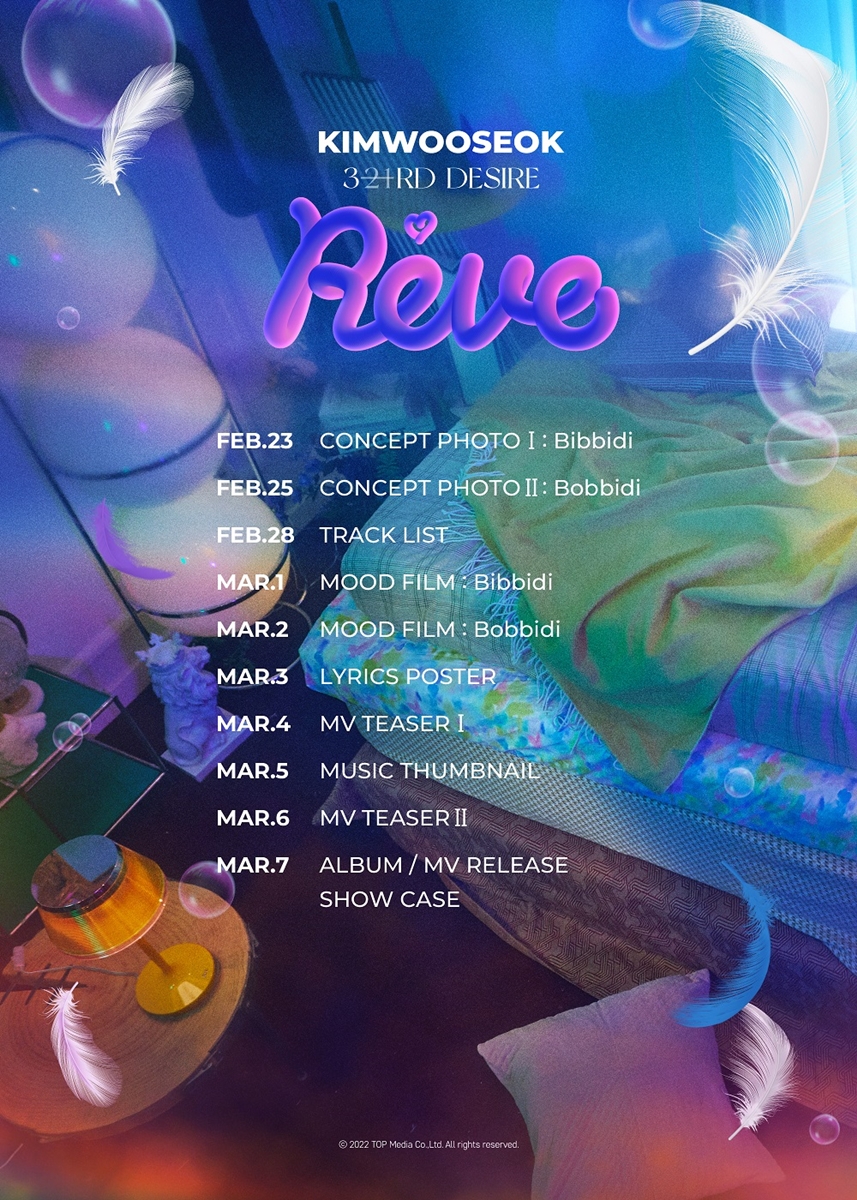 เที่ยงคืนของวันที่ 21 กุมภาพันธ์ที่ผ่านมา Kim Woo Seok (คิมอูซอก) ได้เปิดเผยตารางการคัมแบ็คของมินิอัลบั้มที่ 3 ’3RD DESIRE [Reve]‘ ในโซเชียลมีเดียของเขาอย่างเป็นทางการ กับภาพตารางงานที่มีแบ็คกราวนด์เป็นบรรยากาศ รอบเตียงนอนอันชวนฝัน ซึ่งได้รับความสนใจจากแฟนๆ อย่างท่วมท้น
