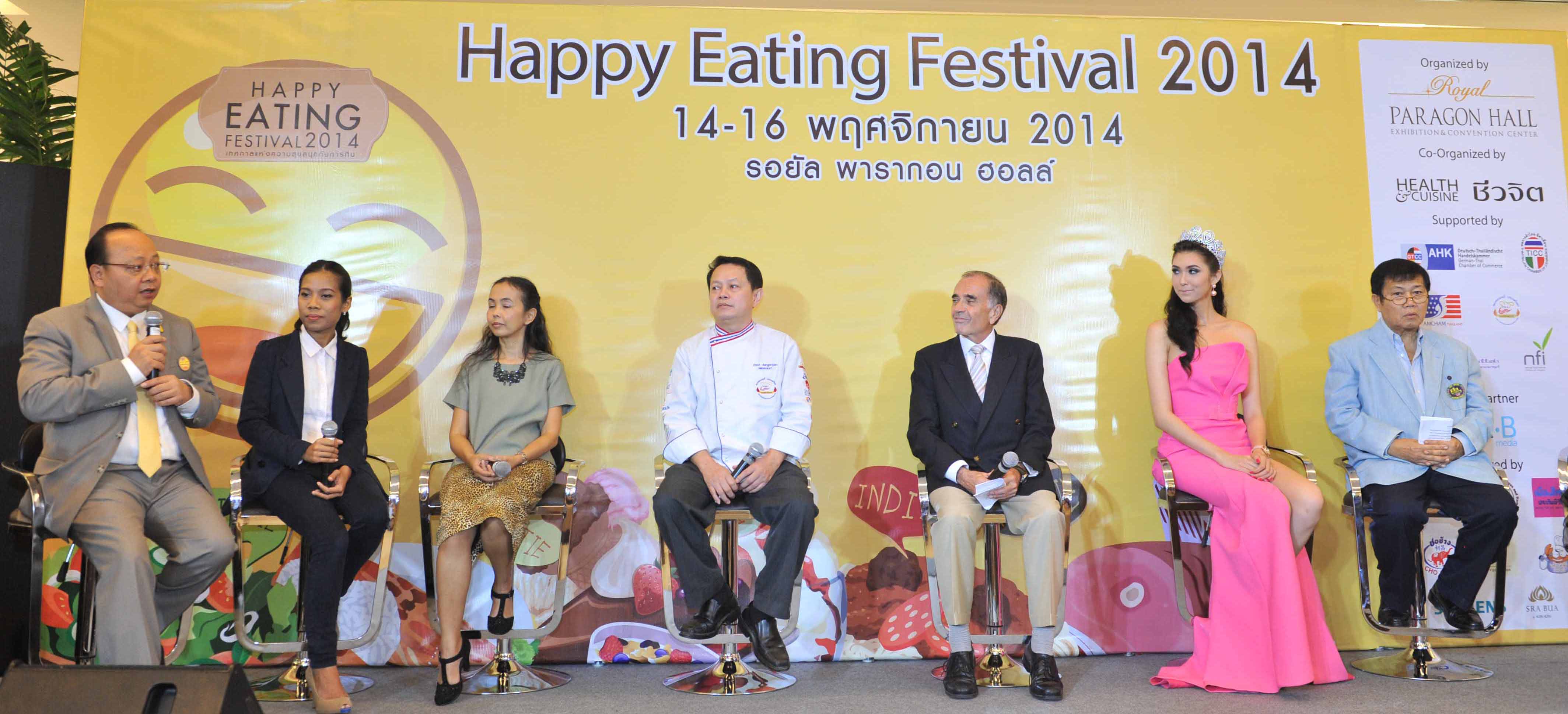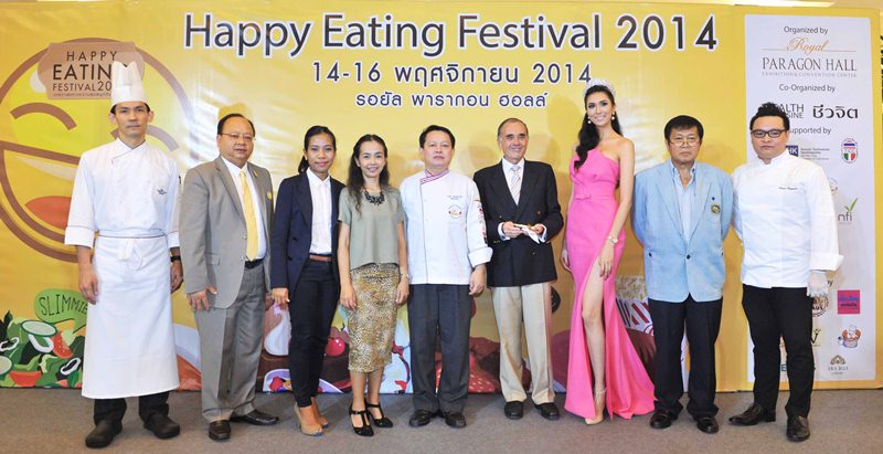 ทาลูน เทง ผู้จัดการทั่วไป รอยัล พารากอน ฮอลล์ กล่าวว่า “บริษัทฯ ได้ร่วมกับนิตยสาร เฮลท์ แอนด์ คูลซีน และนิตยสารชีวจิต เตรียมมอบความสุขและประสบการณ์แปลกใหม่สำหรับนักชิม ในงาน “Happy Eating Festival 2014เทศกาลแห่งความสุขสนุกกับการกิน” ในระหว่างวันที่14 – 16 พฤศจิกายน ศกนี้โดยจะเป็นเทศกาลอาหารครั้งยิ่งใหญ่ใจกลางกรุงเทพมหานครที่ระดมร้านอาหารที่โด่งดังมากมายกว่า 100 ร้านดังจากจังหวัดต่างๆ ทั่วประเทศมาเสิร์ฟความอร่อยภายใต้คอนเซ็ปต์ Ready to Eatทีคัดสรรเมนูอาหารคาวและอาหารหวานสำเร็จรูป มาให้เลือกนั่งรับประทานได้ทั้งภายในงานหรือเลือกช้อปกลับบ้าน และพิเศษเตรียมพบกับร้านดังในโลกโซเซียลมีเดียที่พร้อมจะมาเปิดร้านให้ชิมช้อปอย่างใกล้ชิด อาทิเจ๊คิวปูม้านึ่ง ที่จะนำขบวนของทะเลสดมาให้เลือกลิ้มลองความอร่อยเสิร์ฟพร้อมน้ำจิ้มรสแซบ, Little Baker Thailand เจ้าของสูตรบราวนี้คัพเค้กแสนอร่อย, Phoenix Lava ซาเปาลาวา แป้งนุ่มที่มาพร้อมกับหลากหลายใส้ให้เลือกชิมเป็นต้น นอกจากประสบการณ์และความประทับใจจากการได้ลิ้มลองอาหารแล้ว ภายในงานมีการจัดโซนร้านค้าจากเหล่าคนดังจากหลากหลายวงการ อาทิ พลอย เฌอมาลย์, น้องมายด์ Net Idol, ดีเจภูมิภูมิใจ ตั้งสง่า,กี๋ฐษชัย ชนะอรรถกาลAF5 ฯลฯ