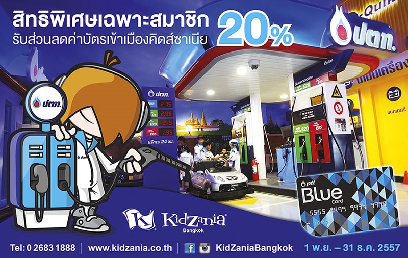 พีทีทีบูลการ์ดจับมือร่วมกับคิดส์ซาเนีย กรุงเทพฯ เติมความสุขให้กับลูกค้าสมาชิกบัตรพีทีทีบูลการ์ด รับส่วนลดทันที 20% ใช้เป็นส่วนลดบัตรเข้าเมืองคิดส์ซาเนีย เงื่อนไขสมาชิกผู้เข้าร่วมกิจกรรม จะต้องแสดงบัตรพีทีทีบูลการ์ด เพื่อรับสิทธิ์ในการเข้าร่วมกิจกรรม หน้าเค้าเตอร์คิดส์สาเนีย กรุงเทพฯ ตั้งแต่วันนี้ – 31 ธันวาคม 2557 คิดส์ซาเนีย กรุงเทพ ศูนย์การเรียนรู้และความบันเทิงสำหรับเด็กอายุตั้งแต่ 4 – 14 ปี โดยมุ่งเน้นการมอบประสบการณ์การเรียนรู้ควบคู่ความสนุกสนาน ผ่านการสวมบทบาทเสมือนจริงตามอาชีพต่างๆที่เด็กๆใฝ่ฝันอยากจะเป็นในอนาคต ให้เด็ก ๆ ได้ทดลองสวมบทบาทมากกว่า 80 อาชีพ อาทิ หมอ นักดับเพลิง พยาบาล ตำรวจ นักข่าว ฯลฯ โดยเปิดให้บริการทุกวัน อาทิตย์-ศุกร์ เวลา 10.00-15.00 น. วันเสาร์-และวันหยุดนักขัตฤกษ์ เวลา 10.00-17.00 น. และ 16.00-21.00 น. สยามพารากอน ชั้น 5 ฝั่งเหนือ สอบถามรายละเอียดเพิ่มเติม โทร 0-2683-1888 หรือเข้าไปดูข้อมูลได้ที่ www.kidzania.co.th และwww.facebook.com/KidZaniaBangkok