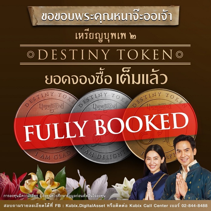 “จีดีเอช” ร่วมกับ บรอดคาซท์ ไทย เทเลวิชั่น ผู้ผลิตภาพยนตร์ร่วมทุนฟอร์มใหญ่ “บุพเพสันนิวาส ๒” และ Kubix ขอขอบคุณแฟนๆ ภาพยนตร์ แฟนคลับ และนักลงทุนทุกท่าน ที่ร่วมสนับสนุนภาพยนตร์ไทย “บุพเพสันนิวาส ๒” ผ่านการซื้อ DESTINY TOKEN (เหรียญบุพเพสันนิวาส ๒) ตอนนี้ยอดจองเหรียญ G จำนวน 15,559 โทเคน เหรียญ D จำนวน 459 โทเคน และ เหรียญ H จำนวน 69 โทเคน ได้ขายหมดเป็นที่เรียบร้อย ก่อนเวลาที่กำหนด ผู้สนับสนุนทุกท่านเตรียมรอรับสิทธิประโยชน์ต่างๆ อีกมากมาย และรอชมภาพยนตร์ บุพเพสันนิวาส ๒ ในโรงภาพยนตร์ก่อนใคร