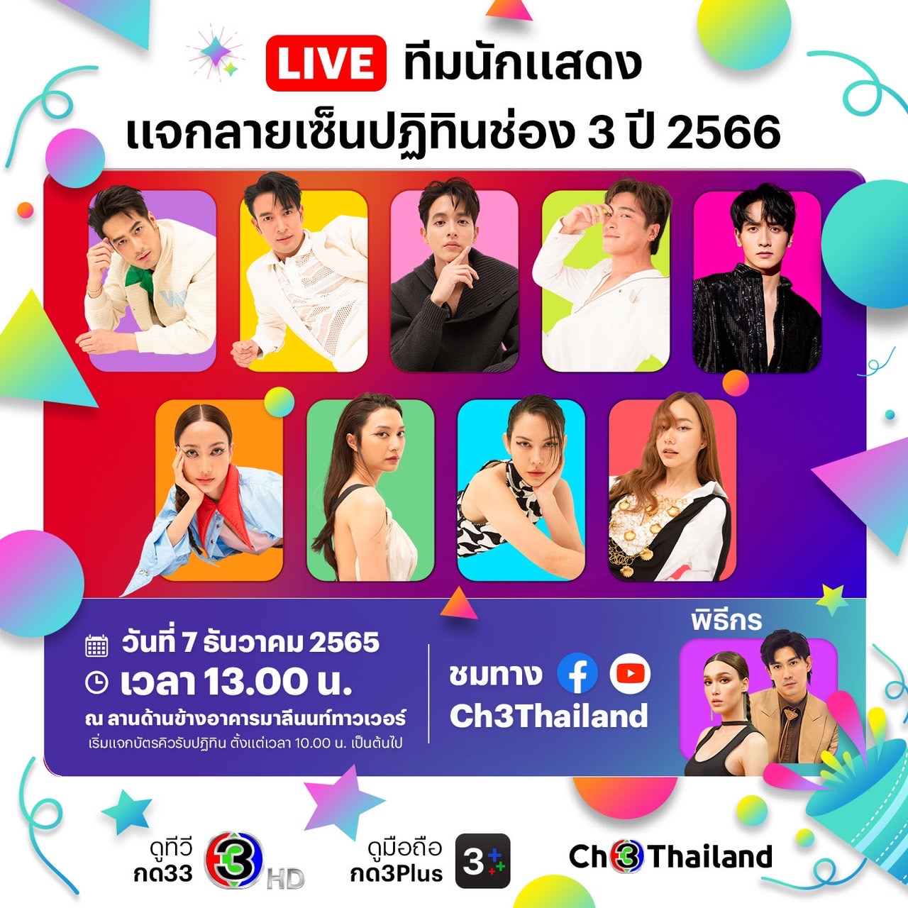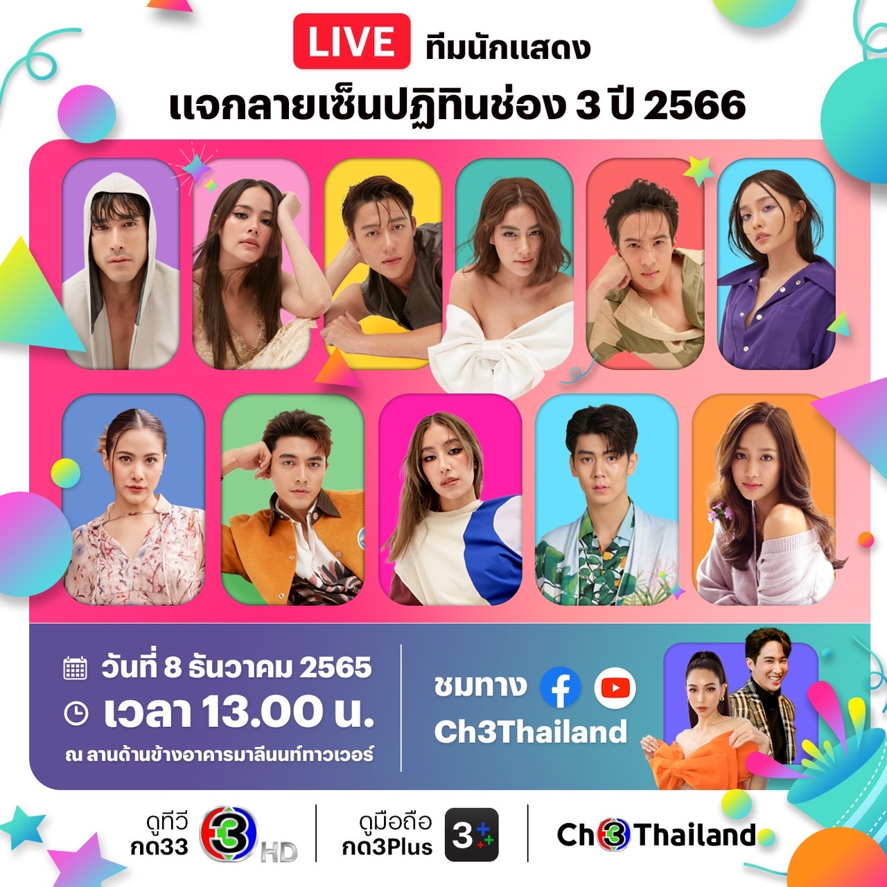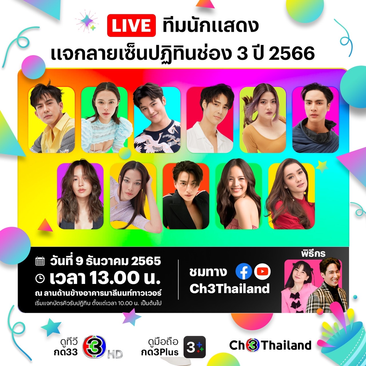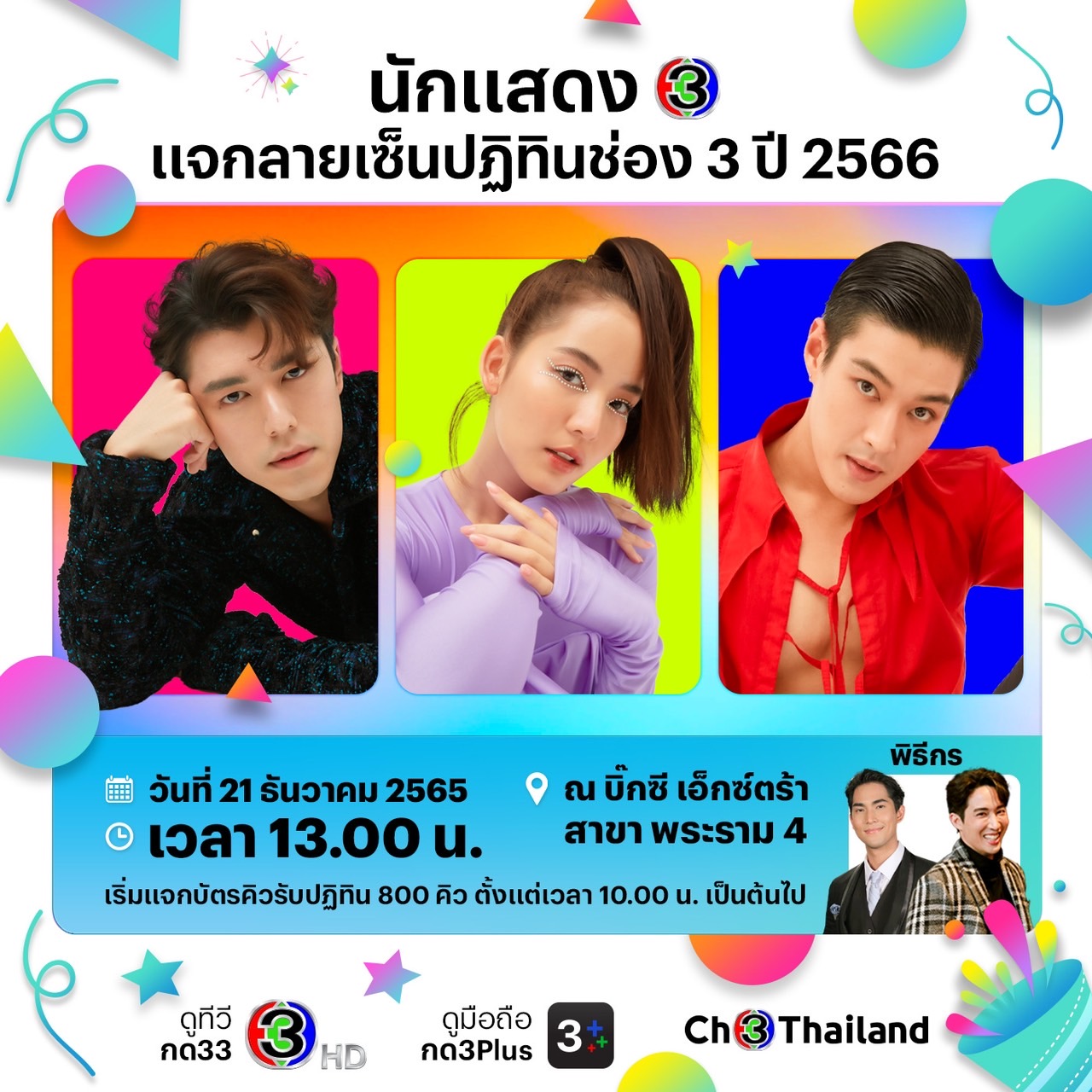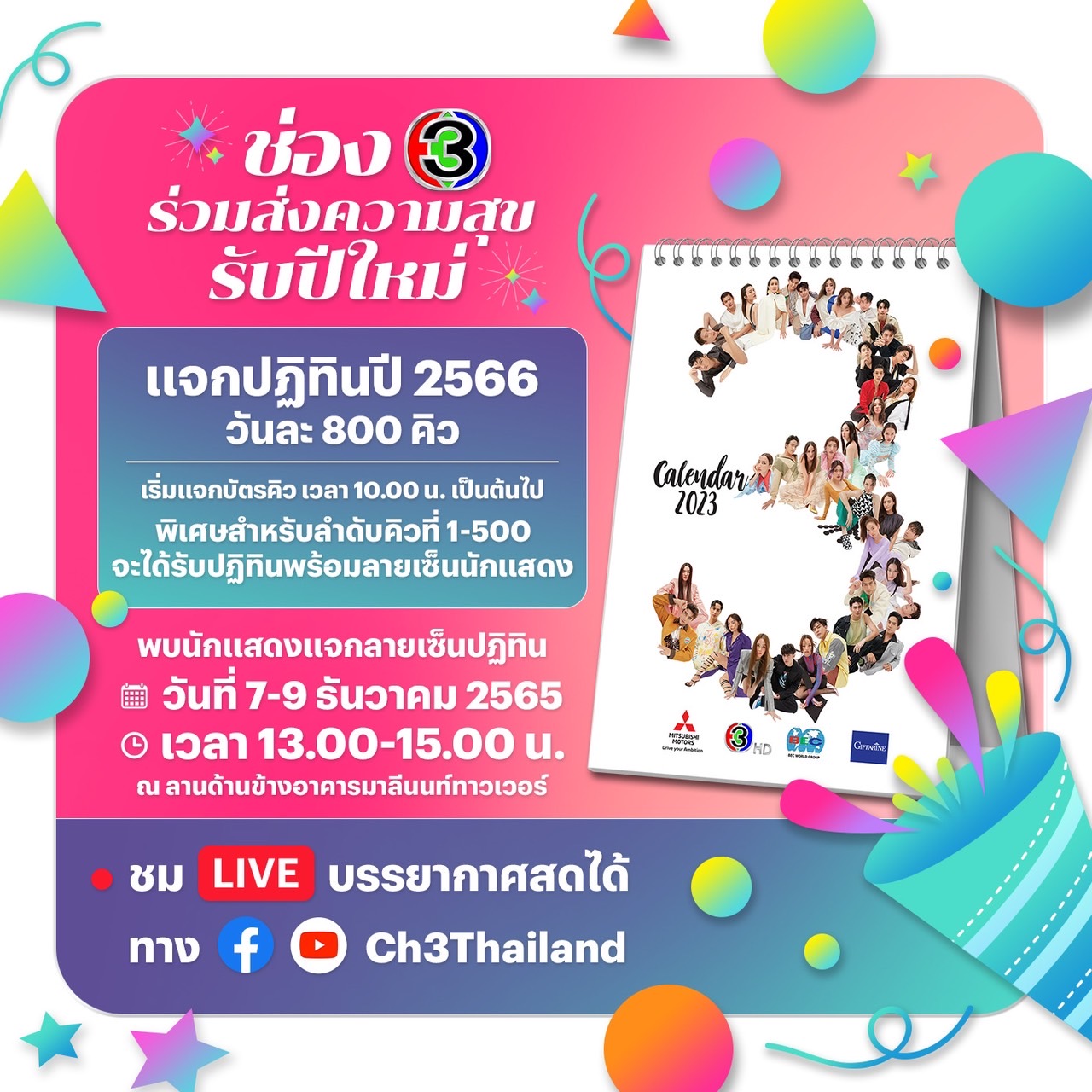 ติดตามนักแสดงที่จะมาเซ็นปฎิทินได้ตามโปสเตอร์แต่ละวัน” งานนี้มี Live บรรยากาศสดผ่าน Facebook และ Ch3Thailand สำหรับผู้ที่ไม่สะดวกมารับปฎิทินสามารถติดตามการแจกปฎิทินช่อง 3 ทางรายการต่าง ๆ ของสถานีฯ รวมถึงช่องทางออนไลน์ Ch3thailand และ 3Plus /// สำหรับผู้ที่ต้องการดาวน์โหลดปฎิทินสามารถดาวน์โหลด ผ่านทาง Ch3thailand และ 3Plus ในวันอาทิตย์ที่ 25 ธันวาคม 2565