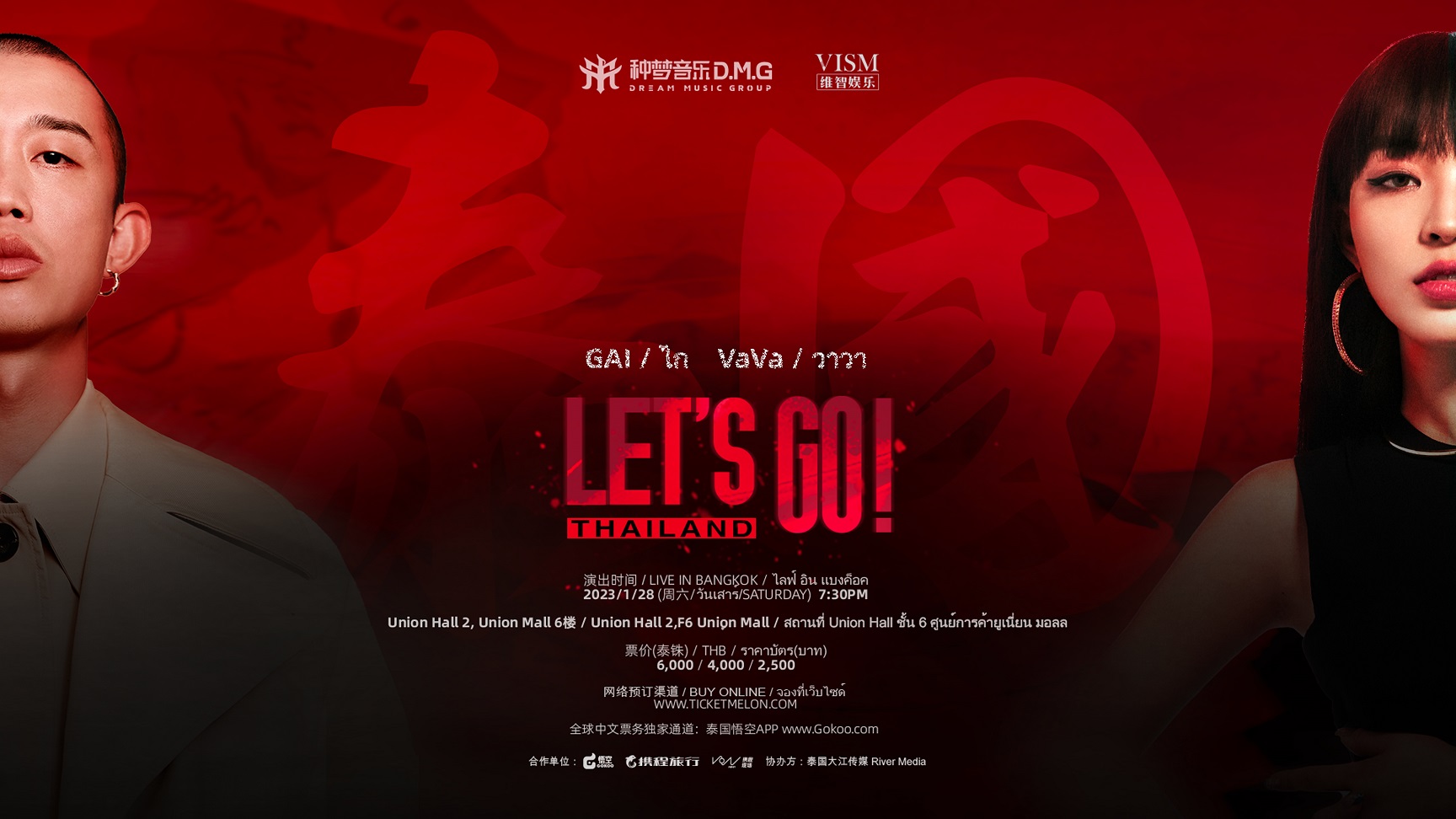 GAI Zhou Yan (D.M.G) & VaVa Mao Yanqi (D.M.G) พร้อมแล้วที่จะมาตอกย้ำให้ทุกคนเข้าใจความหมายของคำว่า ‘ดนตรีไม่มีพรมแดน!’… แล้วพบกันในคอนเสิร์ต “ไกวาวาเล็ทส์โกไทยแลนด์” (Let’s Go Thailand)วันเสาร์ที่ 28 มกราคม 2566 เวลา 19.30 น. ณยูเนี่ยนฮอลล์ 2 ศูนย์การค้ายูเนี่ยนมอลล์บัตรราคา6,000 / 4,000 และ 2,500 บาทซื้อบัตรได้แล้ววันนี้ที่www.ticketmelon.com