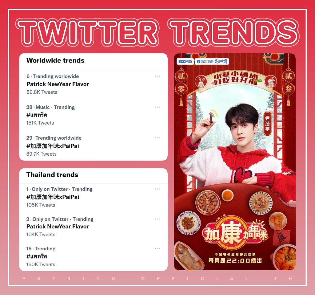 เรียกได้ว่าเริ่มต้นความปังตั้งแต่ต้นปีกันเลยทีเดียว สำหรับหนุ่มหล่อมากความสามารถ “แพทริค หยิ่นฮ่าวอวี่ (尹浩宇)” หรือ “แพทริค INTO1” ด้วยผลงานวาไรตี้รายการพิเศษ “加康加年味” ที่เพิ่งออนแอร์ทางช่อง Zhejiang STV นับเป็นการร่วมงานวาไรตี้กับช่องเจ้อเจียงทีวีเป็นครั้งที่สามแล้ว มาครั้งนี้กระแสรายการแรงผลตอบรับดี เรตติ้งพุ่งติดอันดับ 1 จากทั้งหมดกว่า 30 รายการทีวีที่ออนแอร์ในช่วงคืนวันที่ 5 มกราคม 2023