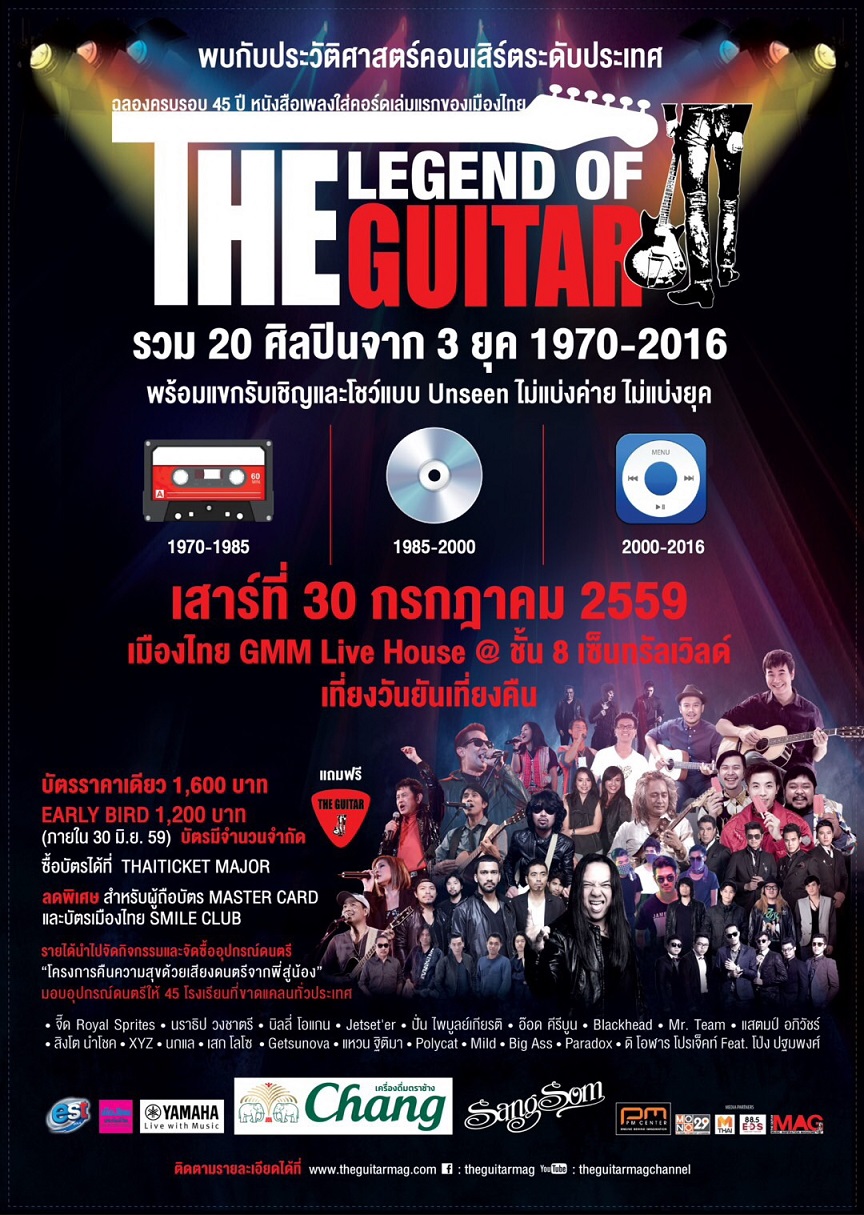 โดยงาน “THE LEGEND OF THE GUITAR” ครบรอบ 45 ปี จะจัดขึ้นใน วันเสาร์ที่ 30 กรกฎาคม 2559 นี้ ณ GMM Live House@ ชั้น 8 เซ็นทรัลเวิลด์ ตั้งแต่ เที่ยงวันยันเที่ยงคืน  (ประตูเปิด 12.00น. การแสดงเริ่มเวลา 14.00น. – 24.00น. (พิเศษ EARLY BIRDราคา 1,200 บาท ภายในวันที่ 30 มิถุนายน 2559 นี้เท่านั้น บัตรมีจำนวนจำกัด) บัตรปกติราคา 1,600 บาท ซื้อบัตรได้ที่ไทยทิคเก็ตเมเจอร์ทุกสาขา www.thaiticketmajor.com และสอบถามข้อมูลเพิ่มเติมได้ที่ www.guitarmag.com หรือ facebook/Theguitarmag.com
