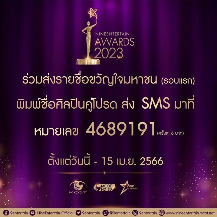 พลาดไม่ได้ที่จะร่วมเป็นส่วนหนึ่งของรางวัล “NINEENTERTAIN AWARDS 2023” (ไนน์เอ็นเตอร์เทน อวอร์ด 2023) ติดตามรายละเอียดเพิ่มเติมได้ในรายการ ไนน์เอ็นเตอร์เทน ทางช่อง 9 MCOT HD หมายเลข 30, www.nineentertain.tv,www.facebook.com/9entertain และ YouTube: Nine Entertain Official