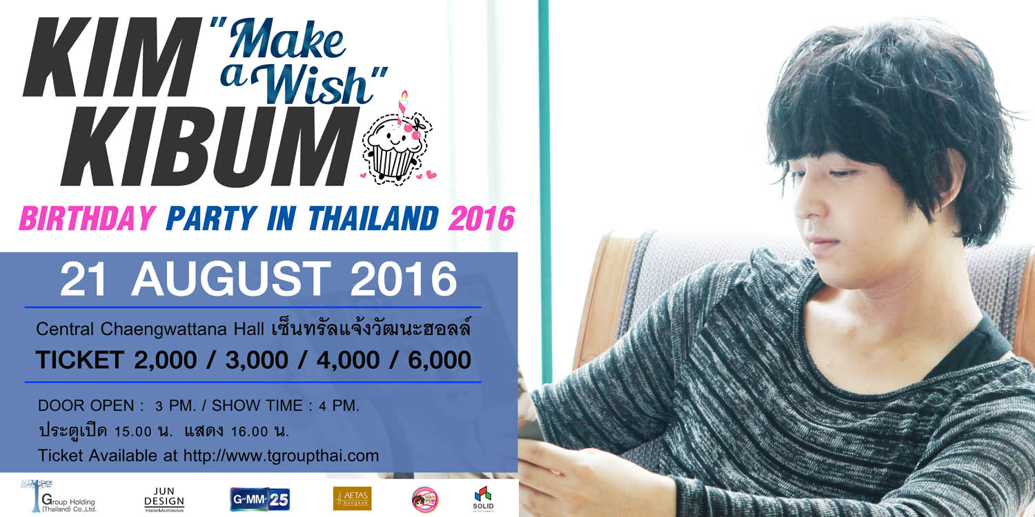 บริษัท ทีกรุ๊ปโฮลดิ้ง (ประเทศไทย) จำกัด  พร้อมแล้วกับการกลับมาลุยจั ดงานเกาหลีอีกครั้ง ขอประเดิมด้วยโปรเจคสุดพิเศษกั บงาน“ Make A Wish” Kim Kibum Birthday Party in Thailand 2016″  งานแฟนมีตติ้งในโอกาสสำคัญของ คิมคิบอม ที่อยากจะร่วมเฉลิมฉลองวันเกิ ดกับแฟนคลับชาวไทย พร้อมมอบของขวัญสุดพิเศษ ไฮทัชทุกที่นั่ง งานนี้รับประกันความใกล้ชิ ดแฟนตัวจริงคิม คิบอมห้ามพลาด