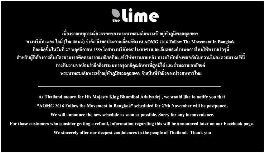 7. AOMG 2016 Follow The Moment In Bangkok กำหนดการเดิม 27 พ.ย. 2559 เลื่อนออกไปจนกว่าจะมีกำหนดการใหม่