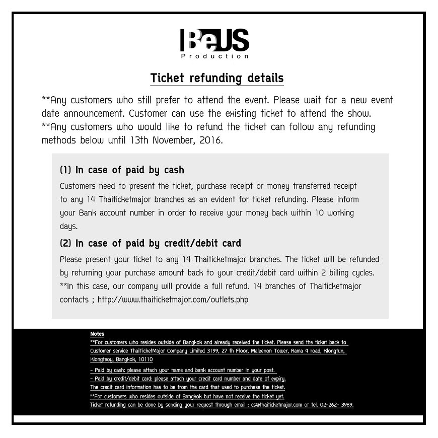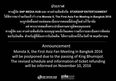 6. “The First Live MonstaX Fan Meeting 2016 in Bangkok” กำหนดการเดิม 12 พ.ย. 2559 เลื่อนออกไปจนกว่าจะมีกำหนดการใหม่ และมีแนวทางการดำเนินการดังนี้