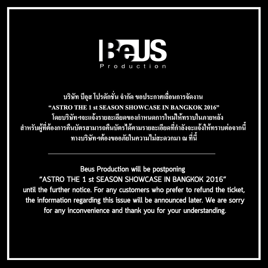 8. “ASTROTHE 1st SEASON SHOWCASE IN BANGKOK 2016” กำหนดการเดิม 29 ต.ค. 2559 เลื่อนออกไปจนกว่าจะมีกำหนดการใหม่ และ มีแนวทางในการจัดการดังนี้