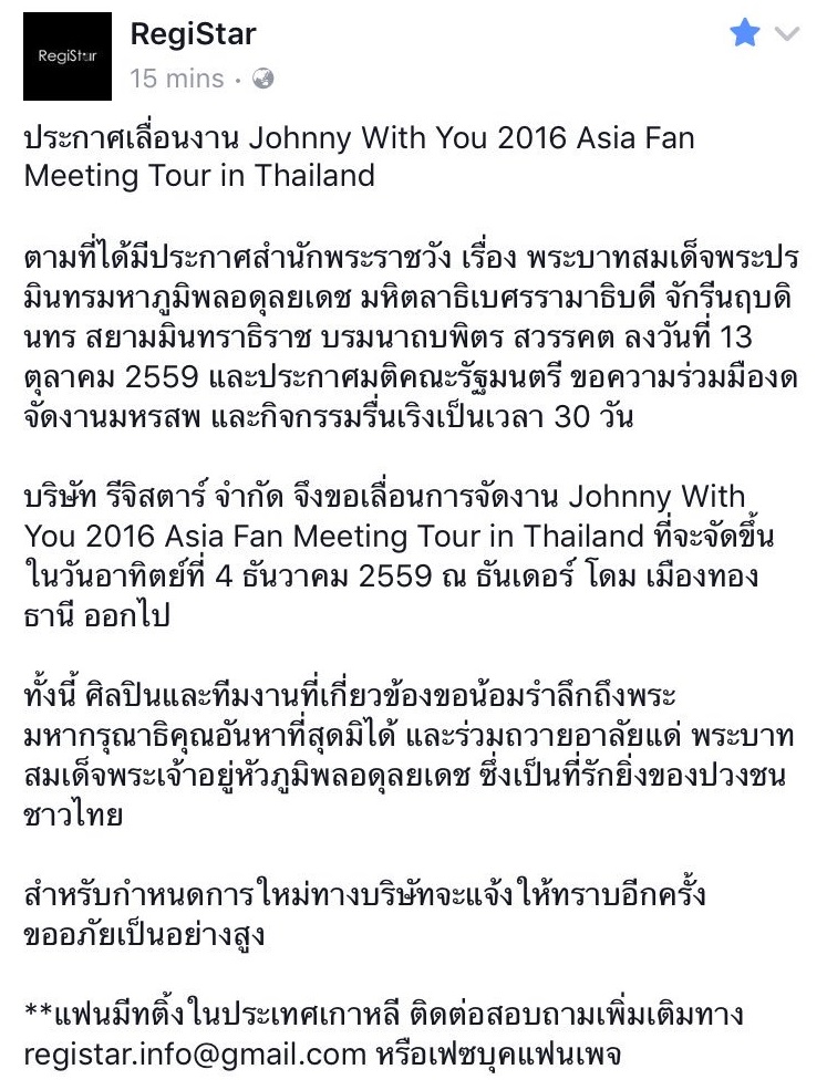 9. Johnny With You 2016 Asia Fan Meeting Tour in Thailand กำหนดการเดิม 4 ธ.ค. 2559 เลื่อนออกไปจนกว่าจะมีกำหนดการใหม่
