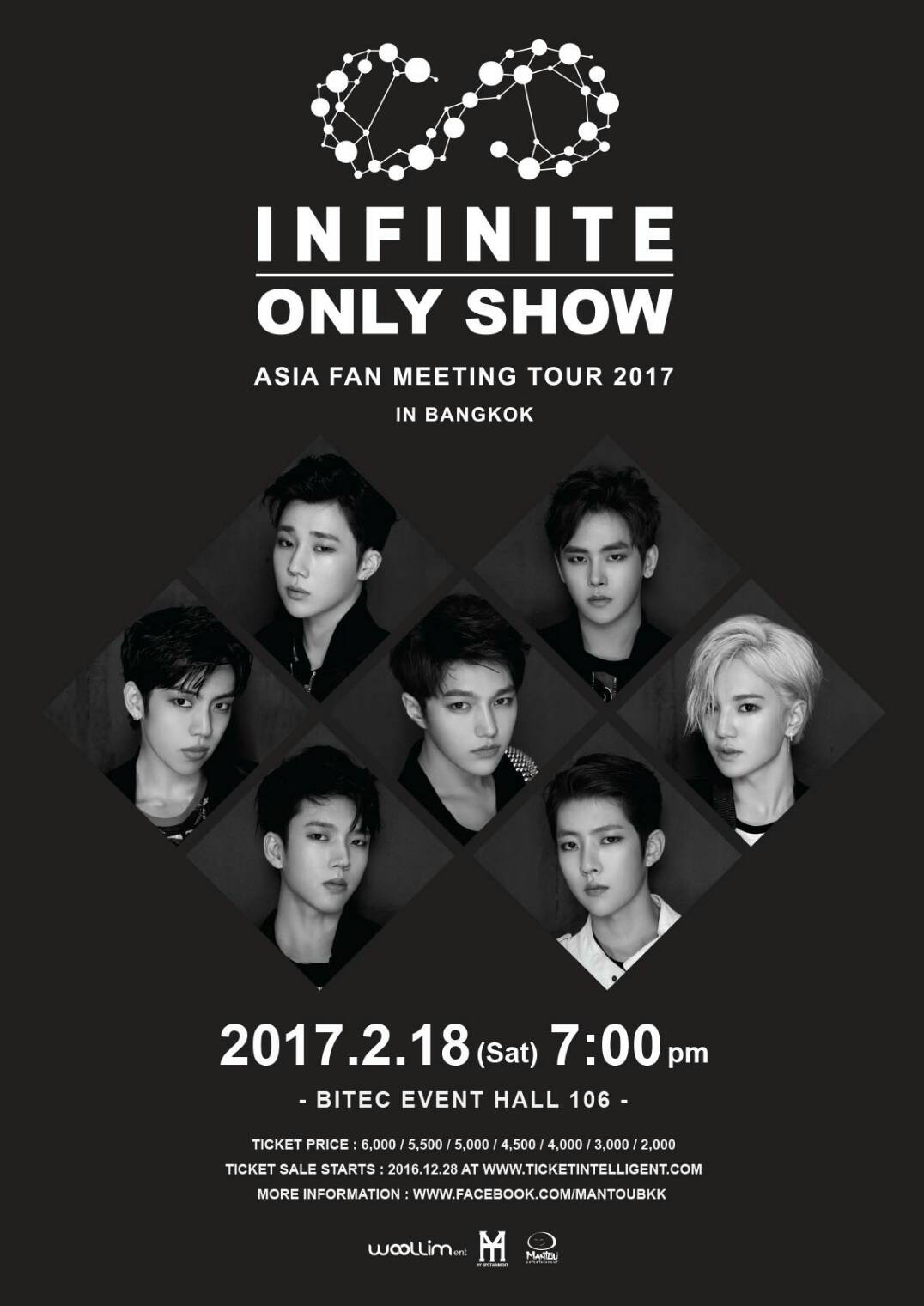 ทำเอาหัวใจของแฟนคลับชาวไทยเต้นรัวๆ และชุ่มฉ่ำรับต้นปีกันเลยทีเดียว เมื่อผู้จัดน้องใหม่ไฟแรง Mantou Entertainment (หมั่นโถว เอ็นเตอร์เทนเม้นท์) และ Woollim Entertainment ต้นสังกัดของ 7 หนุ่มฮอต INFINITE (อินฟินิท) นำทีมโดย Kim Sung Kyu (คิมซองกยู) Jang Dong Woo (จางดงอู) Nam Woo Hyun (นัมอูฮยอน) Hoya (โฮย่า) Lee Sung Yeol (อีซองยอล) L (แอล) และ Lee Sung Jong (อีซองจง) ประกาศแฟนมีตติ้งเอเชียทัวร์และไทยแลนด์บ้านเราเป็นเมืองแรกที่หนุ่มๆ จะเปิดทัวร์ในงาน “2017 Infinite Only Show Asia Fan Meeting Tour in Bangkok” วันเสาร์ที่ 18 กุมภาพันธ์ 2017 ณ BITEC Event Hall 106