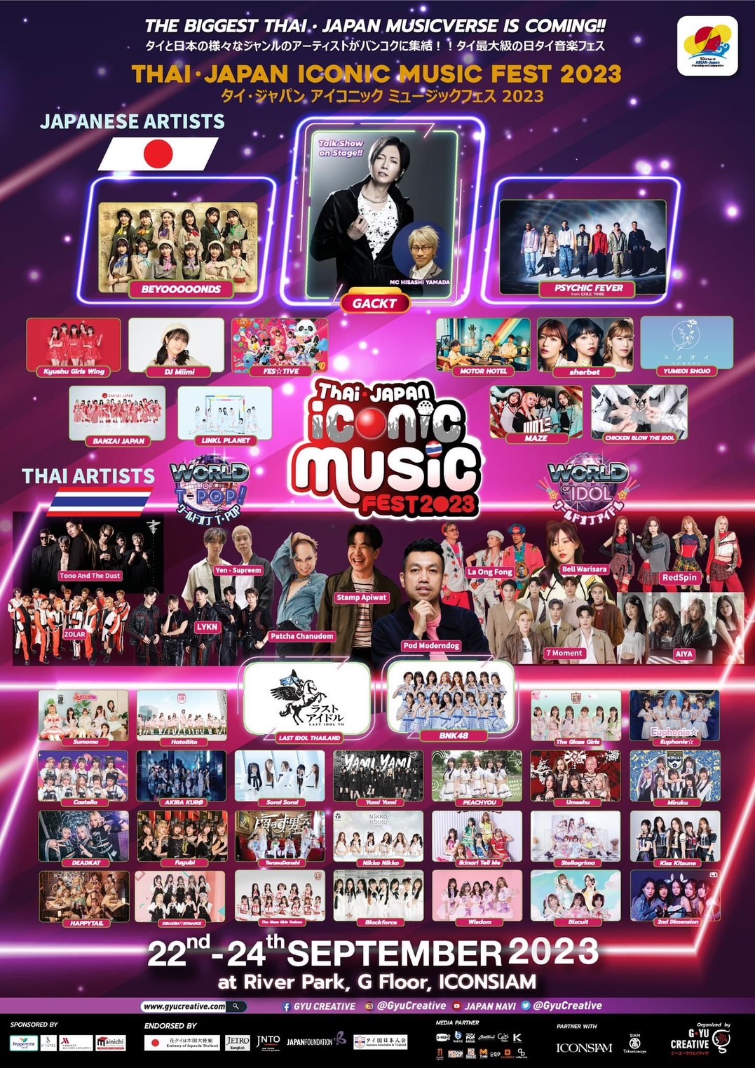 ด้าน คุณยุพเรศ เอกธุระประคัลภ์ ประธานบริหาร บริษัท จี-ยู ครีเอทีฟ จำกัด กล่าวว่า งาน Thai-Japan Iconic Music Fest 2023 ในปีนี้ได้จัดขึ้นอย่างยิ่งใหญ่ แบ่งออกเป็น 2 เวทีใหญ่คือ  River Stage (Main Stage) ซึ่งจะเป็นเวทีใหญ่ริมแม่น้ำเจ้าพระยา ณ ริเวอร์ พาร์ค และเวที SkyStage จัดที่ ICONSIAM PARK 1 ชั้น 2 และยังมีกิจกรรมต่างๆมากมาย ที่เจริญนคร ฮอลล์ ชั้น M และรัษฎา ฮอลล์ ชั้น 1 ซึ่งในงานนี้ถือเป็นการรวมตัวของเหล่าศิลปินญี่ปุ่นที่ยิ่งใหญ่ที่สุดในประเทศไทยอีกครั้ง นำทัพศิลปินโดย GACKT (แก๊กต์) นักร้องเจ-ร็อกและนักแสดงชื่อดังมากความสามารถ ในกิจกรรมSpecial Live!! ทอล์คโชว์ พร้อมกับพิธีกรดีเจชาวญี่ปุ่นชื่อดัง Hisashi Yamada (ฮิซาชิ ยามาดะ), BEYOOOOONDS (บียอนส์) กลุ่มศิลปินสาวมากความสามารถจากประเทศญี่ปุ่น จะบินตรงมาร่วมโชว์ความสนุก ความน่ารัก ความสดใส และความสามารถด้านดนตรีแบบ FULL TEAM ประกอบไปด้วยสมาชิก Ichioka Reina (อิชิโอกะ เรอินะ) Shimakura Rika (ชิมาคุระ ริกะ) Nishida Shiori (นิชิดะ ชิโอริ) Eguchi Saya (เอกุจิ ซายะ) Takase Kurumi (ทาคาเสะ คุรุมิ) Maeda Kokoro (มาเอดะ โคโคโระ) Yamazaki Yuhane (ยามาซากิ ยูฮาเนะ) Okamura Minami (โอคามุระ มินามิ) Kiyono Momohime (คิโยโนะ โมโมฮิเมะ) Hirai Miyo (ฮิราอิ มิโยะ) Kobayashi Honoka (โคบายาชิ โฮโนกะ) Satoyoshi Utano (ซาโตโยชิ อุตาโนะ) และ โชว์สุดพิเศษ!! จาก DJ Miimi หนึ่งในสมาชิกสุดน่ารัก