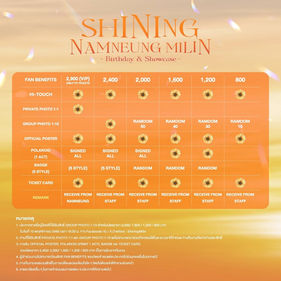 สำหรับงาน “SHINING NAMNEUNG MILIN Birthday & Showcase” เปิดจำหน่ายบัตร วันเสาร์ที่ 30 กันยายน 2566 เวลา 10.00 น. เป็นต้นไป โดยช่องทาง www.theconcert.com