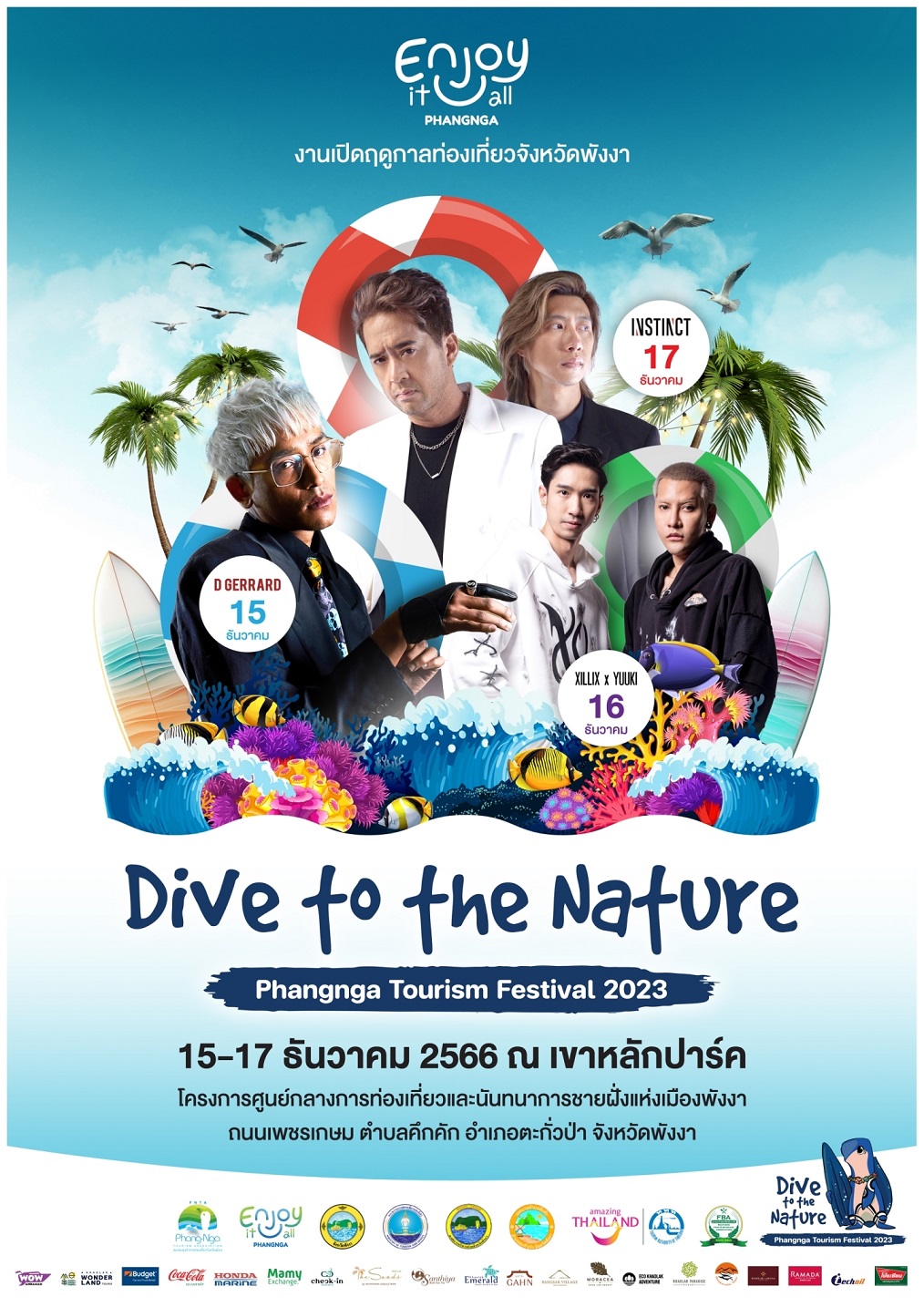 “งานเปิดฤดูกาลท่องเที่ยวจังหวัดพังงา Phangnga Tourism Festival 2023” เที่ยวพังงา สไตล์ Dive To The Nature – Enjoy It All สัมผัสกับธรรมชาติที่ยังเป็น Pure Nature ทั้งโลกใต้ทะเลอันดามัน ภูเขา ลำธาร น้ำตก สุขใจไปกับศิลปวัฒนธรรม วิถีชีวิตชุมชน สินค้าท้องถิ่น และอิ่มอร่อยไปกับ World Cuisine อาหารเลิศรสจากโรงแรมชั้นนำ พร้อมจัดเต็มความสนุกทั้ง แสง สี เสียง การแสดงพื้นเมืองและคอนเสิร์ตจากศิลปินชื่อดัง อาทิ Instinct (อินสติงต์), D Gerrard (ดี เจอร์ราร์ด), DJ.XILLIX และ DJ.YUUKI กำหนดจัดงานระหว่างวันที่ 15-17 ธันวาคม 2566 ณ เขาหลักปาร์ค โครงการศูนย์กลางการท่องเที่ยวและนันทนาการชายฝั่งแห่งเมืองพังงา ถนนเพชรเกษม ตำบลคึกคัก อำเภอตะกั่วป่า จังหวัดพังงา ตั้งแต่เวลา 16:00 น. เป็นต้นไป