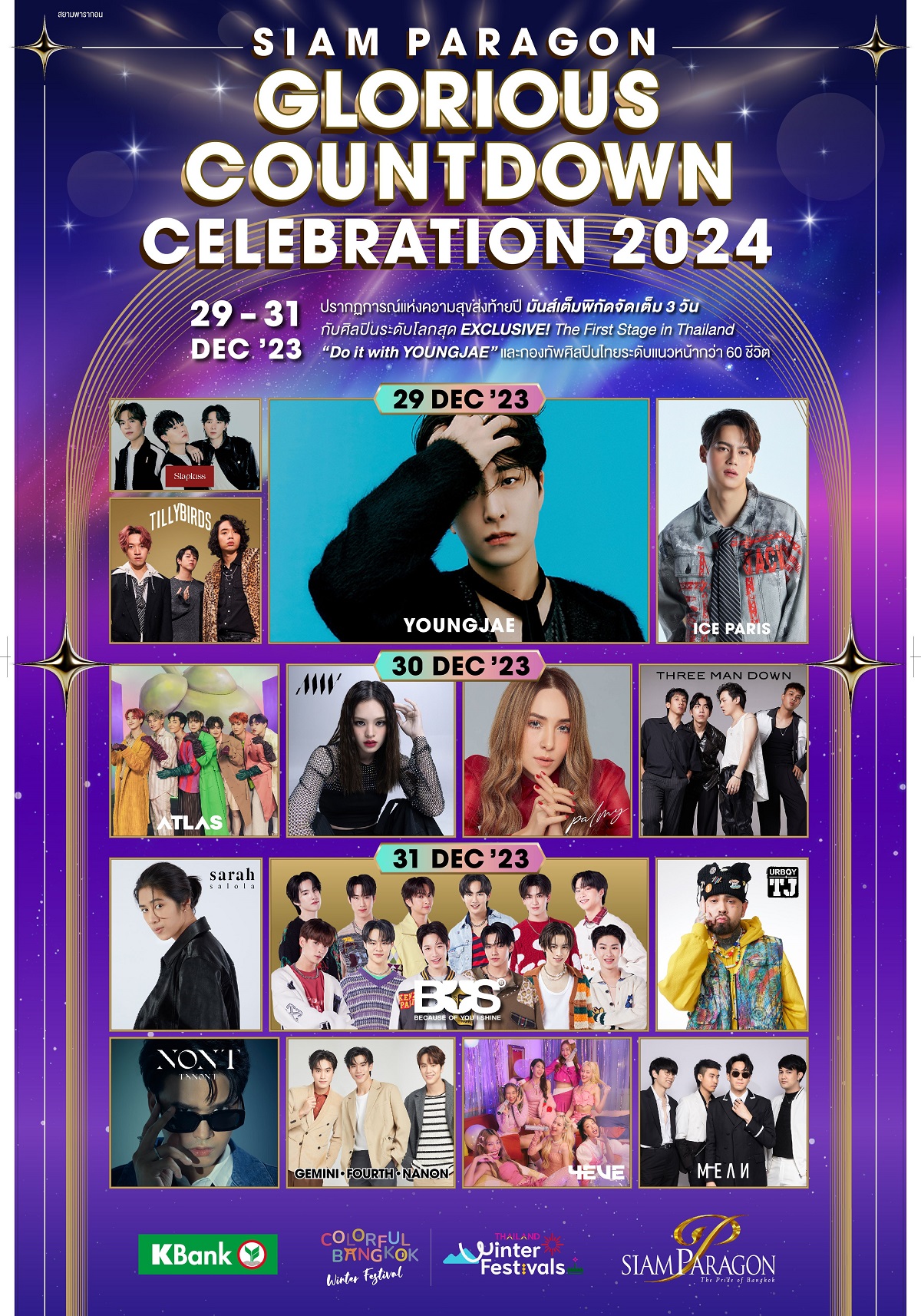 ความเป็นที่ 1 ในใจ หรือ Top of Mind ของลูกค้าชาวไทยและนักท่องเที่ยวต่างชาติ ร่วมกับการท่องเที่ยวแห่งประเทศไทย (ททท.) และ ธนาคารกสิกรไทย มอบประสบการณ์สุดมหัศจรรย์เพื่อเป็นของขวัญในโอกาสพิเศษ จัดงาน “สยามพารากอน เดอะ กลอเรียส เคานต์ดาวน์ เซเลเบรชั่น 2024” (Siam Paragon The Glorious Countdown Celebration 2024) เปิดเวทีเคานต์ดาวน์สุดยิ่งใหญ่ก่อนใคร คว้าศิลปินเคป๊อปชื่อดังระดับโลก ชเว ยอง แจ หรือ ยองแจ GOT7 เมนโวคอล แห่ง GOT7 เปิดโชว์สุดพิเศษ ที่แรก!! และร่วมนับถอยหลังเข้าสู่ศักราชใหม่ 2024 ในวันศุกร์ที่ 29 ธันวาคม 2566 พร้อมยกทัพมหกรรมความบันเทิงเต็มรูปแบบ ด้วยคอนเสิร์ตแบบนอนสต็อป จากกองทัพศิลปินดังร่วมมอบความสุข ความประทับใจให้กับนักท่องเที่ยวทั้งชาวไทยและต่างชาติ อย่างเต็มอิ่มตลอด 3 วันเต็ม ระหว่างวันที่ 29-31 ธันวาคม 2566 ณ พาร์ค พารากอน ชั้น M สยามพารากอน เปิดเข้าชมฟรี! พร้อมมอบโปรโมชั่นสุดพิเศษแห่งปีและกิจกรรรมความสนุกทั่วทุกพื้นที่