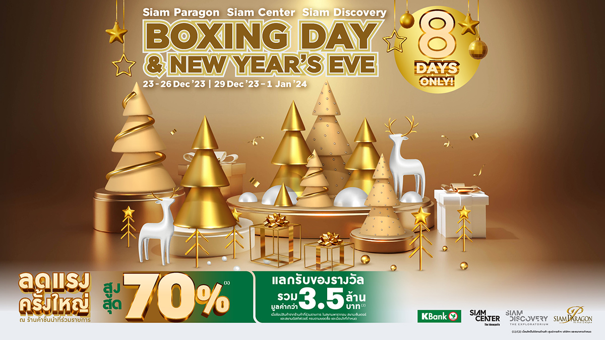 นอกจากนี้ สยามพารากอน ยังมอบความคุ้มค่าต่อเนื่องในช่วงเทศกาล Boxing Day ระหว่างวันที่ 23 ธ.ค.66 – 26 ธ.ค.66 และ New Year’s Eve ระหว่างวันที่ 29 ธ.ค.66 – 1 ม.ค.67 ลดสูงสุดกว่า 80% และช้อปครบ ช้อปครบ 20,000.- ขึ้นไป โดยพิเศษสุดสำหรับผู้ใช้จ่ายผ่านบัตรเครดิตกสิกรไทยเมื่อช้อปเพียง 18,000.-ขึ้นไป แลกรับ SIAM GIFT CARD มูลค่า 1,200 บาท (จำกัดรวม 200 รางวัล/วัน)