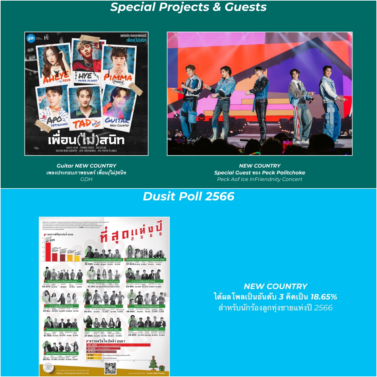 โดยในตลอดทั้งปี 2566 น้องๆ NEW COUNTRY ทั้ง 6 คน เอ็มโบว์,นุ,กีต้าร์,ติณติณ,กิ๊ก และมัทรี ก็มีผลงานเพลงออกมาอย่างต่อเนื่องเช่นเพลง “เฉือนใจ” “มีคนเสียใจแล้วหนึ่ง” “รบกวนเอ็นดู” และเพลงจากโปรเจคซนซน 40 ปี GMM “โอ้ละหนอ …My Love” และที่ตอกย้ำความสำเร็จของ NEW COUNTRY อย่างเห็นได้ชัดคือ ในแอพพลิเคชั่น TIKTOK มียอดคนใช้แผ่นเสียงทุกเพลงรวมกันของ NEW COUNTRY มากกว่า 1 ล้านคลิป