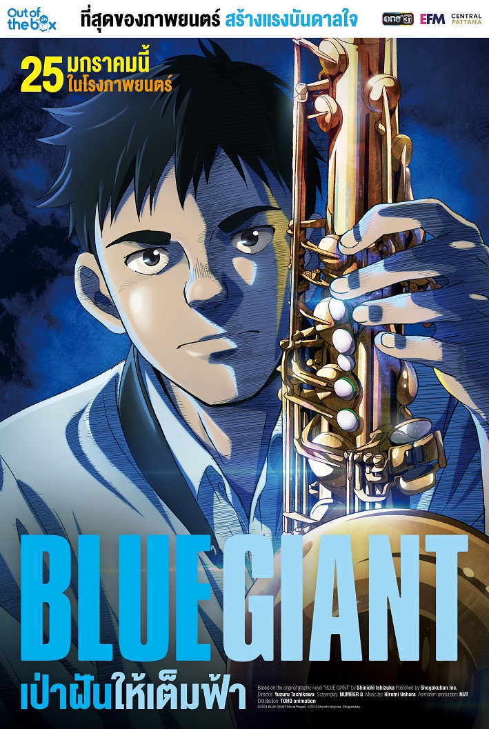 Out of the box by GDH เปิดตัวภาพยนตร์ “BLUE GIANT เป่าฝันให้เต็มฟ้า” จาก ‘มังงะสุดฮิต’ ยอดพิมพ์กว่า 11 ล้าน! สู่ที่สุดของ ‘ภาพยนตร์’ สร้างแรงบันดาลใจ ภาพยนตร์ที่เล่าเรื่องถึง “มิยาโมโตะ ได” นักเรียนมัธยมปลาย ผู้เริ่มเล่นแซ็กโซโฟนเพราะหลงใหลในดนตรี ไม่ว่าจะวันฝนตกฟ้าร้องหรือลมกรรโชก เขาก็ไม่เคยว่างเว้นจากการฝึกเป่าเทเนอร์แซ็กโซโฟนริมฝั่งแม่น้ำตามลำพัง และใฝ่ฝันว่าจะเป็น “นักดนตรีแจ๊สเบอร์หนึ่งของโลก” ให้ได้ หลังเรียนจบ ไดตัดสินใจเดินทางเข้าโตเกียวเพื่อไล่ตามความฝันของตัวเอง ก่อนได้เจอกับ “ทามาดะ ชุนจิ” เพื่อนร่วนชั้นสมัยมัธยมปลาย ที่ตัดสินใจเริ่มเล่นกลองหลังเห็นความมุ่งมั่นของได และ “ซาวาเบะ ยูกิโนริ” นักเปียโนฝีมือดี จนนำสู่การก่อตั้งวงดนตรีของพวกเขาเองที่มีชื่อว่า “JASS” เป้าหมายของสมาชิกไม่ว่าจะเป็น “ได” ผู้ตั้งอกตั้งใจเป่าแซ็กโซโฟนอย่างเต็มกำลัง “ยูกิโนริ” ผู้ทุ่มเททุกสิ่งให้กับดนตรีมาตั้งแต่วัยเยาว์ และ “ทามาดะ” ผู้อยู่ในฐานะมือใหม่หัดเล่น คือการขึ้นแสดงที่คลับระดับสูงนาม “So Blue” และพลิกโฉมวงการดนตรีของญี่ปุ่น