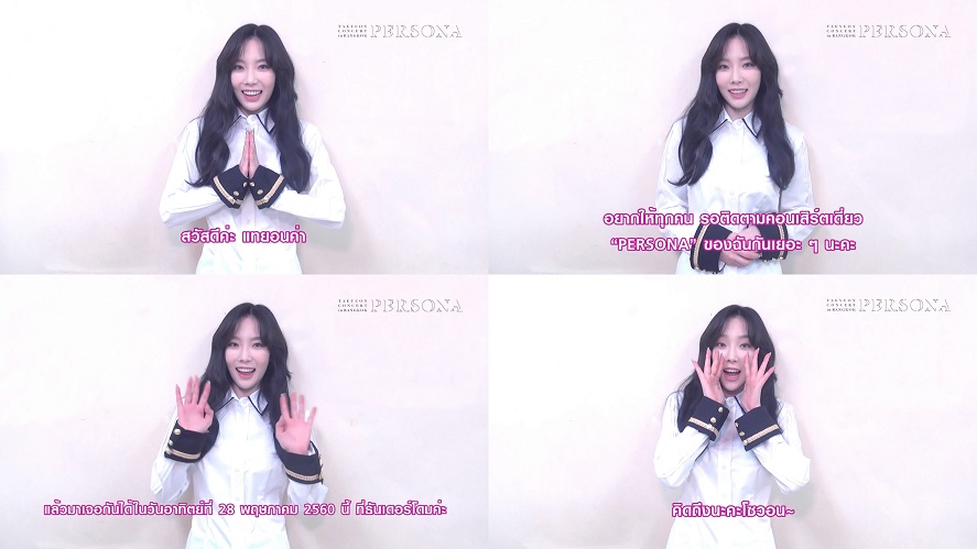 “สวัสดีค่ะ แทยอนค่า โซวอน~ สวัสดีค่ะ แทยอนนะคะ ในที่สุด ฉันก็จะได้ไปเจอกับทุกคนพร้อมกับคอนเสิร์ตเดี่ยวของฉันแล้วค่ะ อยากให้ทุกคน รอติดตามคอนเสิร์ตเดี่ยว “PERSONA” ของฉันกันเยอะ ๆ นะคะ แล้วมาเจอกันได้ในวันอาทิตย์ที่ 28 พฤษภาคม 2560นี้ ที่ธันเดอร์โดมค่ะ คิดถึงนะคะโซวอน~”