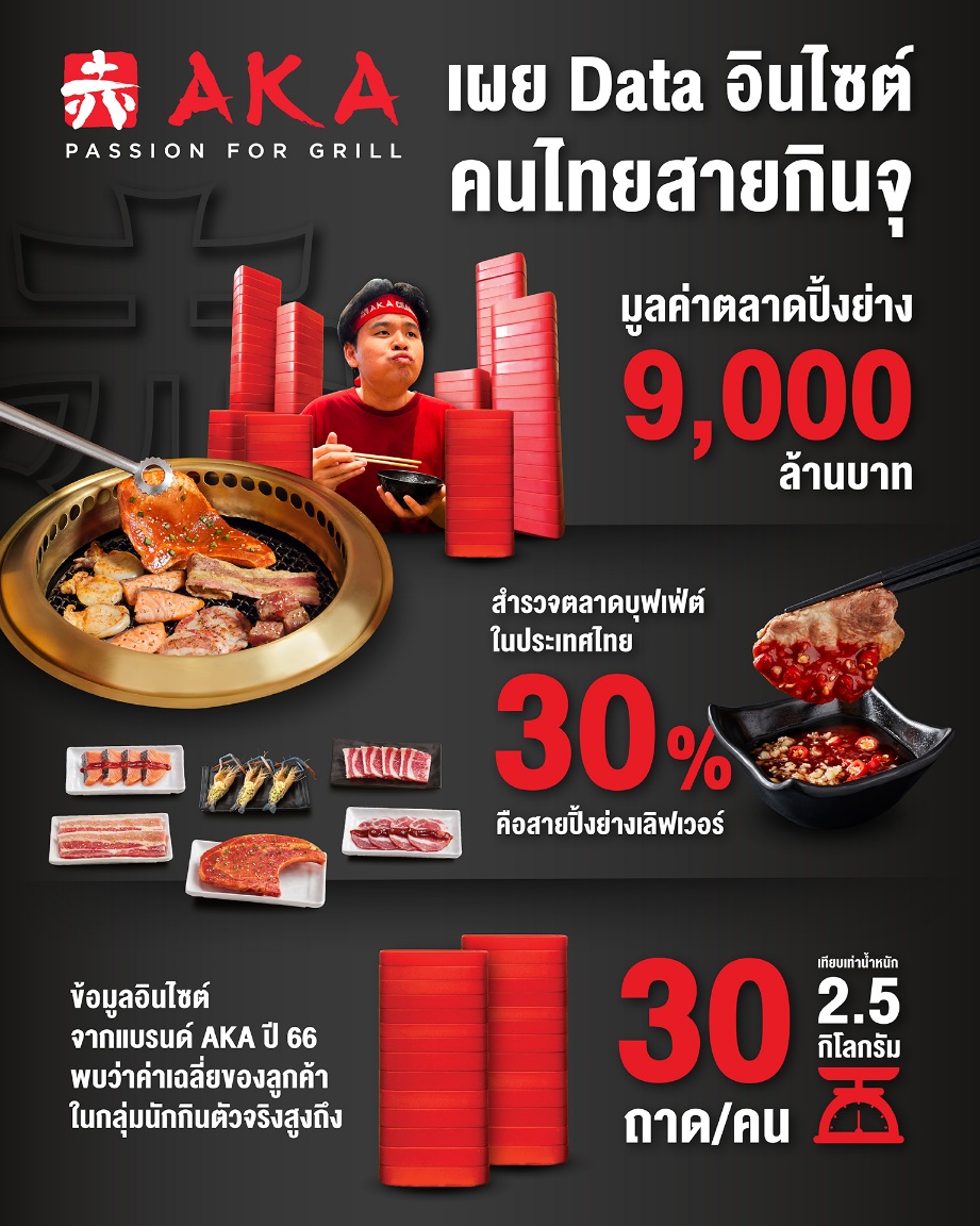 บุฟเฟต์คนไทยคือปิ้งย่างเลิฟเว่อสูงถึง 30% รวมถึงข้อมูลอินไซต์ของแบรนด์ AKA ตลอดปี 66 ที่ผ่านมานั้น พบว่าลูกค้ากลุ่มนักกินตัวจริงที่เข้ามากินปิ้งย่างที่ร้าน กินได้เฉลี่ยถึง 30 – 40 ถาดต่อคน หรือเทียบเท่ากับน้ำหนักประมาณ 2.5 กิโลกรัมเลยทีเดียว ส่งผลถึงความท้าทายใหม่ที่ทีมการตลาดต้องทำการบ้านกันอย่างหนัก เพื่อตอบโจทย์ความต้องการของผู้บริโภค บนเป้าหมายของการสร้าง Awareness และอยากให้ AKA เป็นจุดรวมกลุ่มคนรักบุฟเฟต์ปิ้งย่างที่เน้นความอร่อยแบบจุก ๆ อย่างแท้จริง รวมถึงการสร้างความคึกคักในตลาดให้ได้มากที่สุด จนในที่สุดก็เกิดเป็นแคมเปญบ้าพลังสมชื่อความเป็น AKA ครั้งใหญ่นี้ขึ้น รับประกันความคุ้มค่าและความจุกแบบจัดเต็มแน่นอน”